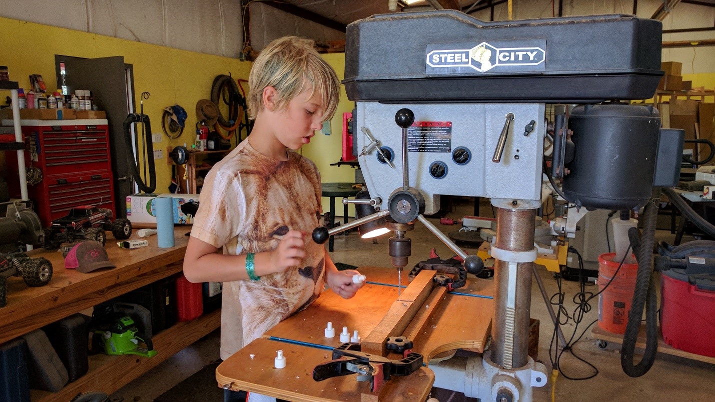 - Assuming that you still have the cap, drill a hole in the cap. Later you will choose ribbons to string through each hole for a hanger. Below, our grandson uses a template for which to drill cap holes in exactly the right place (Figure 1).