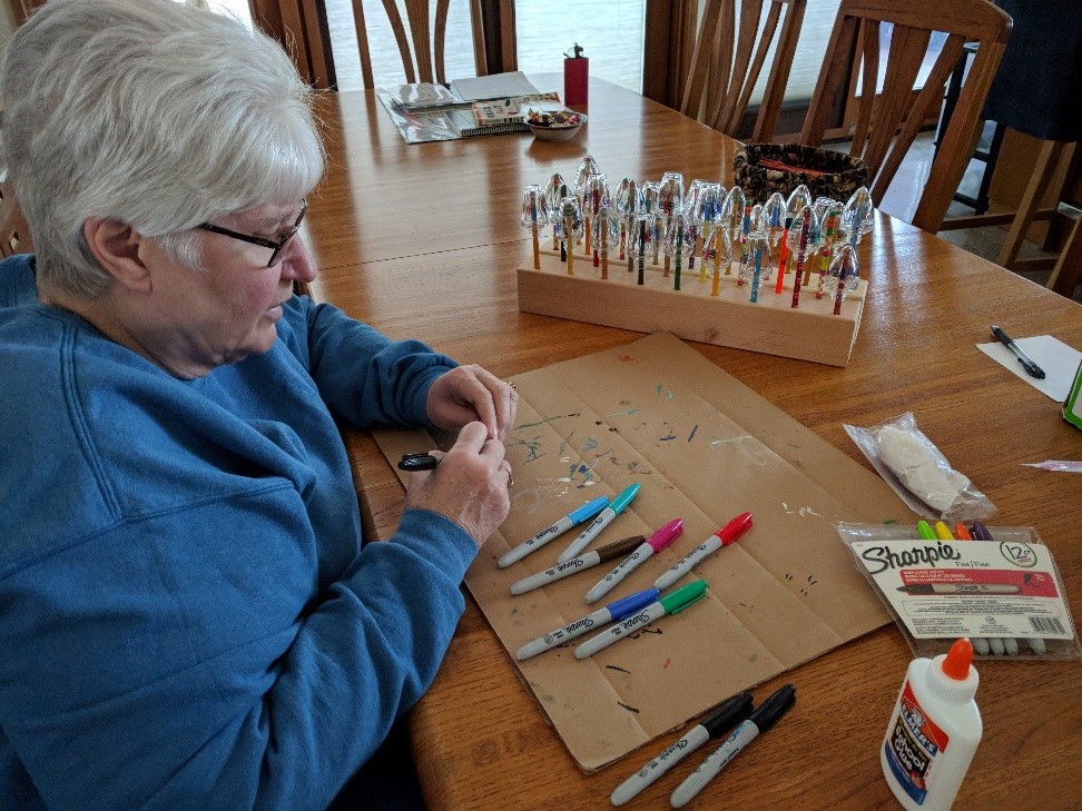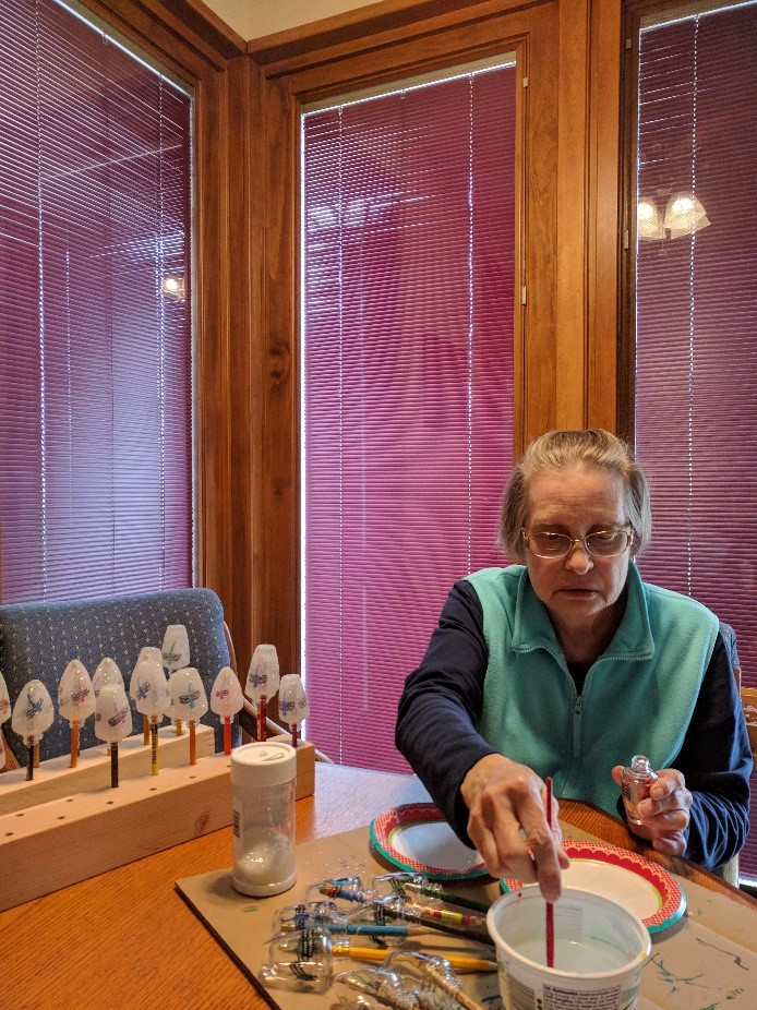 My sister-in-law Suzy Coose is the talented person. She is in charge of painting dragonflies, birds, flowers, and butterflies on the empty bottles. My grandkids and I usually are her helpers for everything else. This winter Phyllis Shuffield had collected many, many bottles for us, so we got to work getting them ready for 2019 Earth Day give-aways.