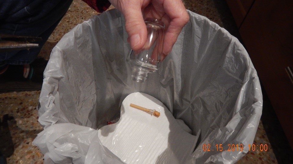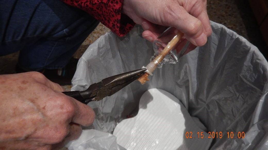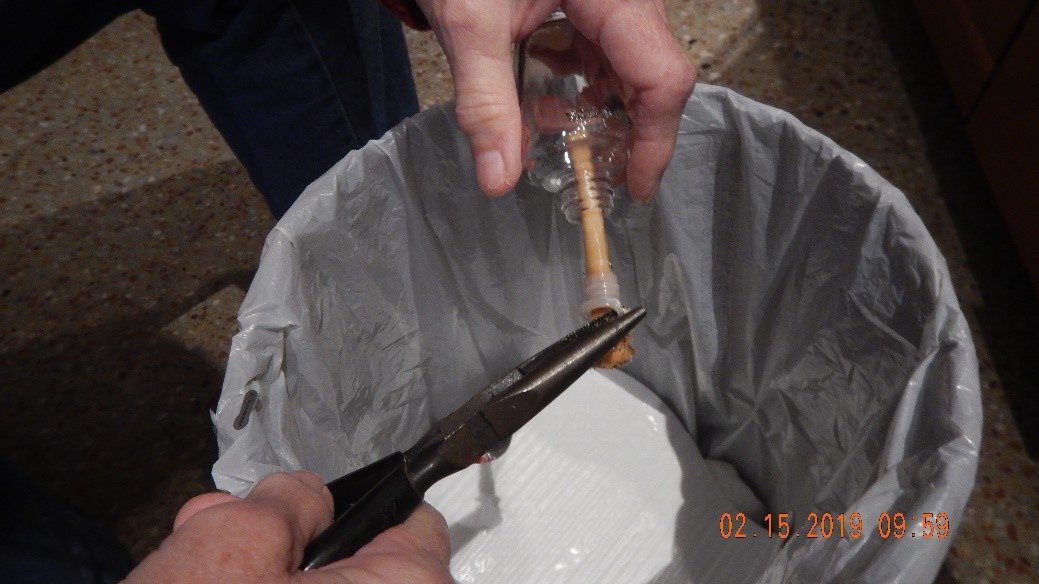 - On the empty bottle, remove any wick with a pair of pliers (Figures 2 and 3 show removal of empty Wallflower bottle wicks).