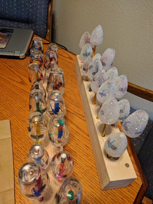 - While each bottle is still wet, sprinkle fine glitter over the wet glue and then place on a drying rack (Figure 8). Figure 9 shows a rack of bottles waiting for the glue and glitter process while finished ones are on another rack.