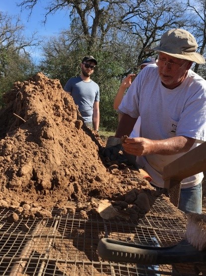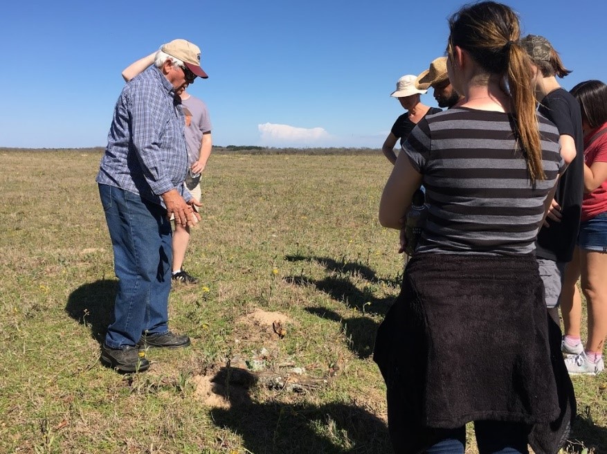 As they hiked, Mike explained how the largest swale (now referred to as the “wet” swale, indicating that the people probably used it when the low area was flooded) at the ranch had been partially uncovered when he was clearing land for possible Houston Toad rehabilitation. (However, it was after this that archeologists Sergio and Melinda Iruegas identified it and several smaller depressions as swales while doing reconnaissance on the ranch.)