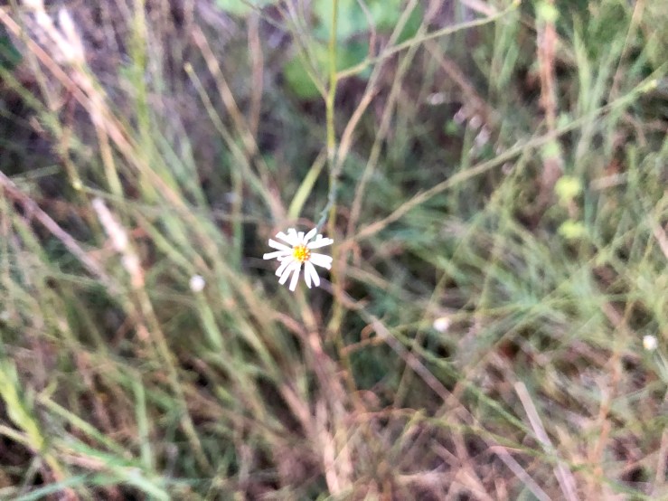 Most of the flowering plants right now seem to have two characteristics: very few or very thin leaves and small blossoms. The two most common examples are the prairie broomweed and yard aster, both of which look practically leafless and have tiny flowers.