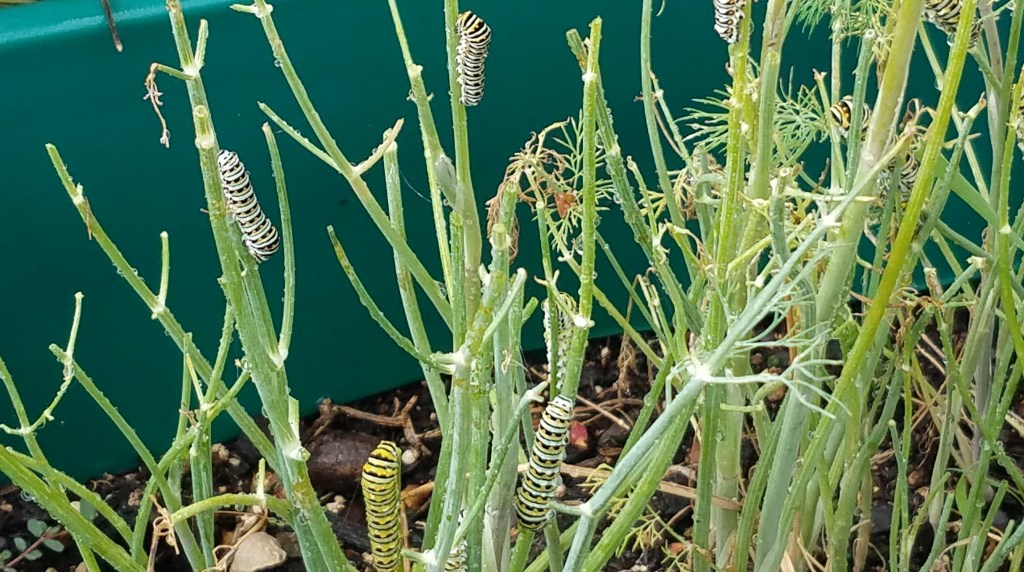 I have had many of these in my bronze fennel plant, and I hope they have gone off to pupate, too! The fennel also hosted the caterpillar of the cabbage looper moth. I’ll plant dill next year, for sure. The more black swallowtails, the better!