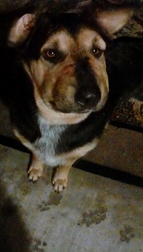 Boscoe got nervous staying inside and ran off in the storm after I brought a doghouse on the porch. I saw him at 5 am again. The Warrior.