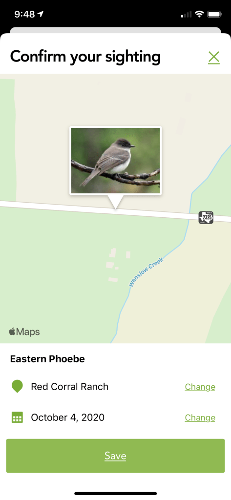 Anyway, I was watching some little birds catching bugs and wondered what they were. It was hard to see through the screen, and I’d forgotten my binoculars. So, I fired up Merlin Bird ID, from Cornell Labs.