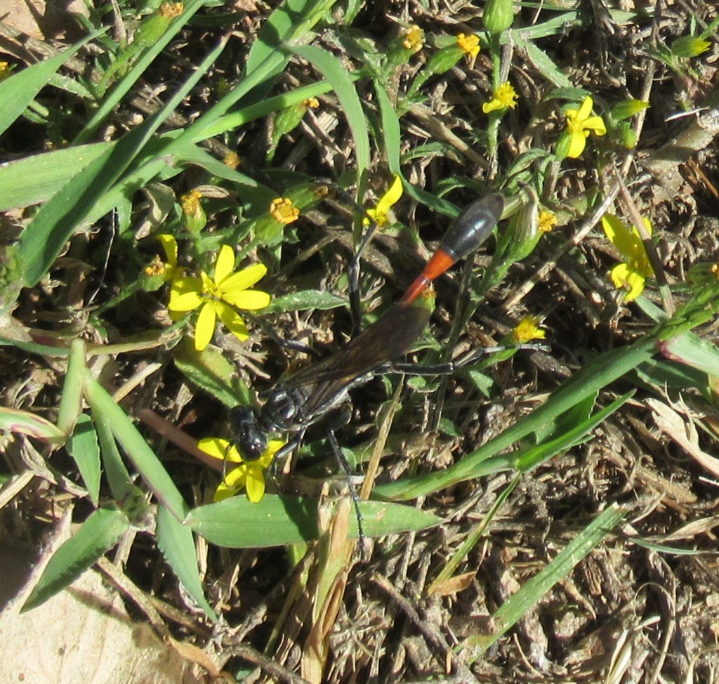 Eric stalked what he has identified as a common thread-waisted wasp (Ammophila procera) until we were both able to take photos of the large wasp.