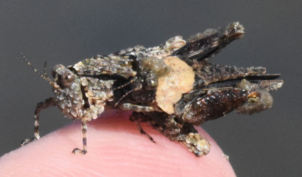 As I started taking photos, I realized there was more than just mud stuck to her. Eventually I realized it was an entire male grasshopper. When I finished with the camera, I put the grasshoppers back where they came from.