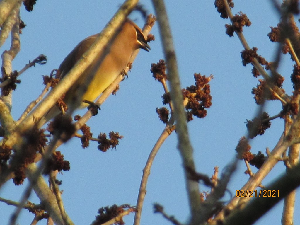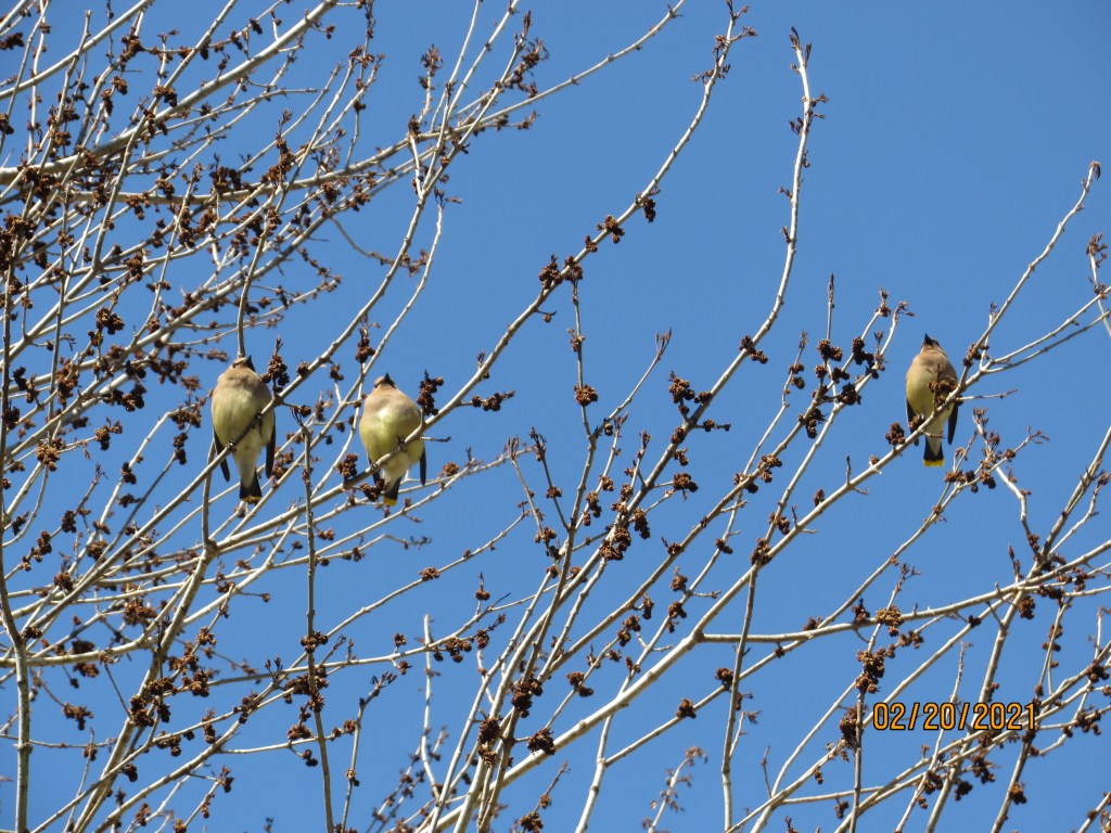 P.S. In an aside, there is a picture of three Cedar Waxwings with their faces pointed toward the sun on Saturday. They seemed to be just taking it in. The chain saw cutting broken branches right below them, did not bother them.