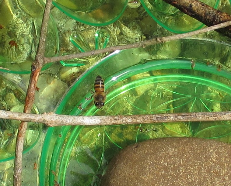 Eureka! On March 12 at noon, I found one bee drinking from the green platter. And one cat. And some ants. On the 12th, it had been pointed out to me that things are starting to bloom and the Monarchs are moving north despite the freeze, so unsaid person was pretty sure that the bees and butterflies would survive without my sugar water.