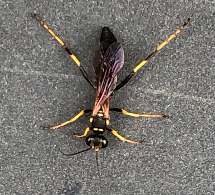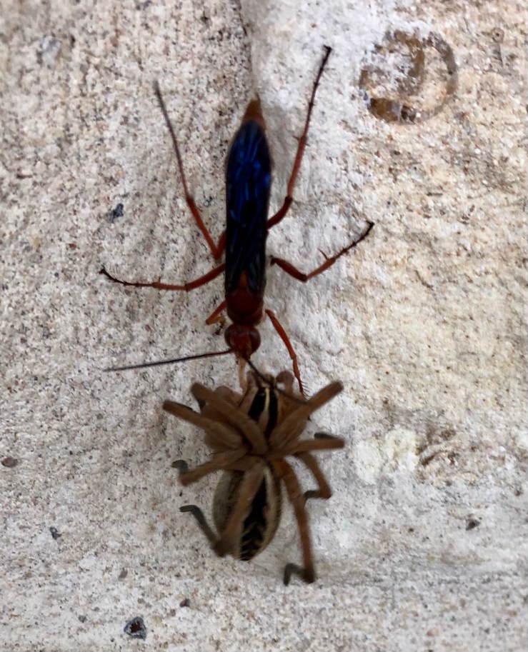 The day before, I has spotted a rabid wolf spider, lying motionless and with its legs all curled up. That was weird. I went to look at something else, and when I came back, I knew what had happened to it. A Rusty Spider Wasp Tachypomplilus ferrugineus had stung it, and now it was dragging it up the wall to wherever it was going to enjoy its spidery meal. It turns out those wasps, which were new to me, prefer wolf spiders as prey.