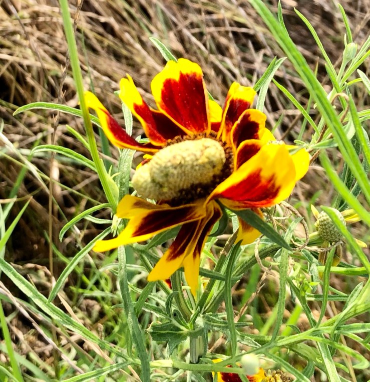 Something else that was new to me this year was my discovery of a bunch of odd-looking, deformed Mexican hat flowers (Ratibida columnifera or upright prairie coneflower). I wrote about them in my personal blog, but have learned more since, thanks to fellow Chapter member, Linda Jo Conn. Alongside of a field that had grown oats for silage, the flowers didn’t look quite right.