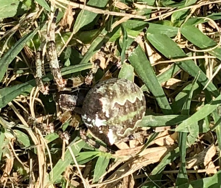 We’ve been digging a lot of holes for fence poles this week, which stirs up the insect population. A couple of days ago, we saw something wriggling on the ground, and I realized it was a spider I’d never seen before. It had beautiful pale green markings and had a very large abdomen.