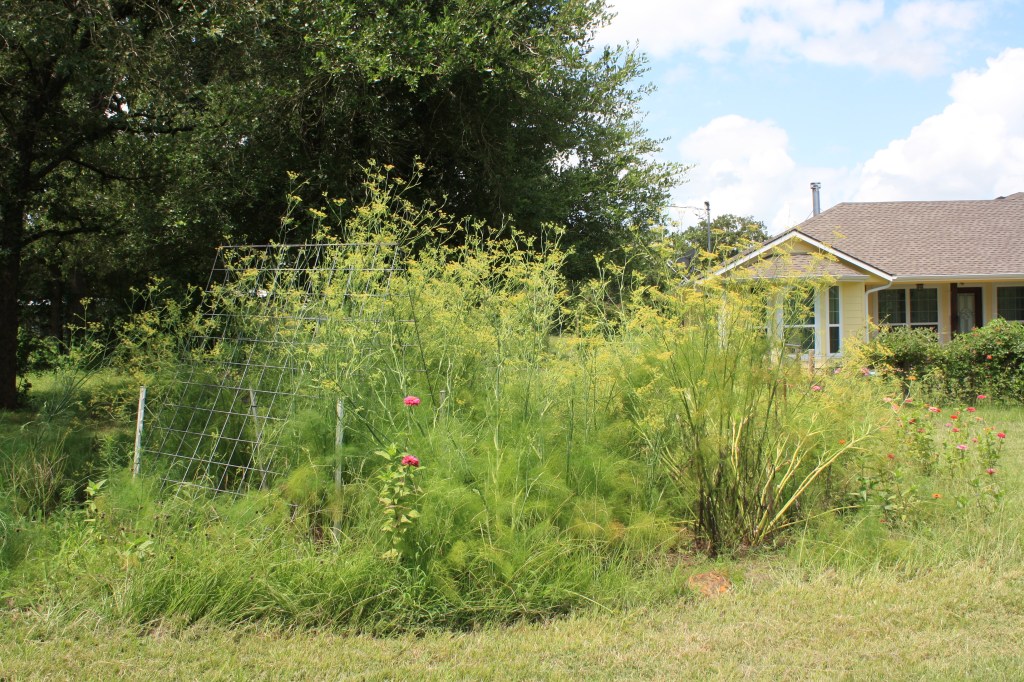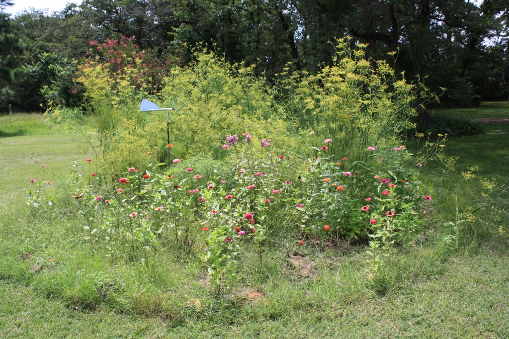 I planted zinnias, fennel, yarrow, sunflowers, sage, coneflowers, salvia, cowpen daisies, and a host of native things that just blew in. Freebies! And very important, I made a perch for the birds to sit on.