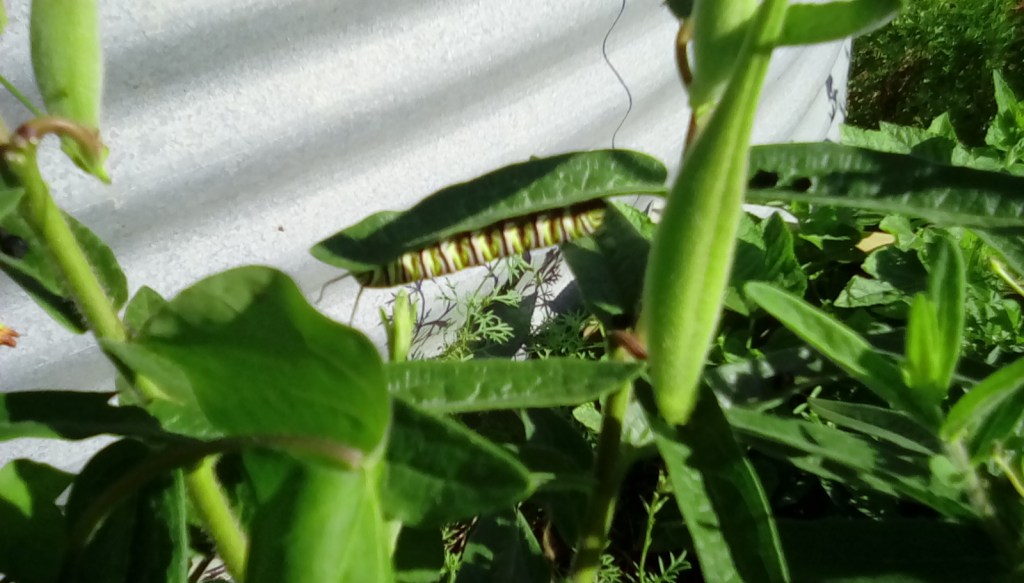 While I was watering and checking milkweed at the Wildscape, I discovered for the first time, Monarch caterpillars.