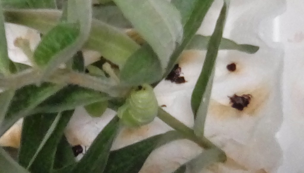 One night the Wildscape Caterpillars formed J’s . Next morning, only one was alive and shaking. My baby was ok. I saw head parts in the paper towels and was relieved to see they had shed their skin for the last time and were now a green chrysalis. I left about 20 minutes and missed seeing the last one turn!