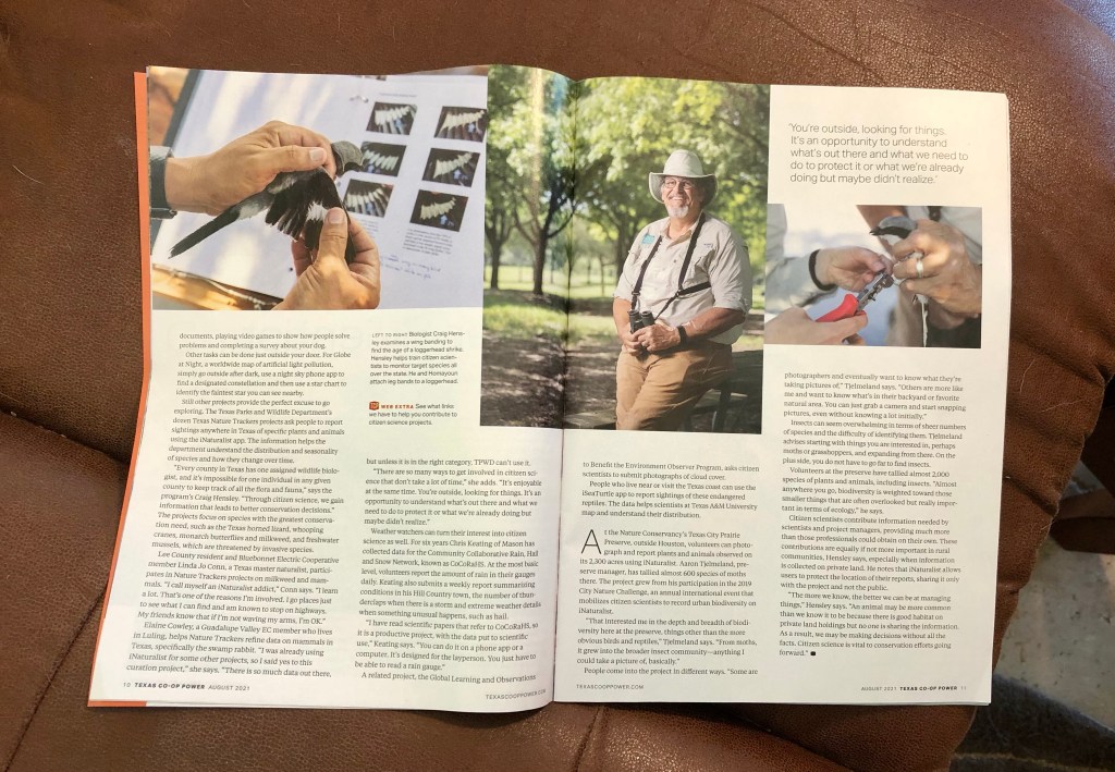 Though the article talks about many opportunities, we’re in there, too. Some of our favorite projects, like CoCoRaHS, are mentioned, along with Nature Trackers and iNaturalist. There are photos of Tania Homayoun and Craig Hensley doing their stuff for Texas Parks and Wildlife and using iNaturalist.