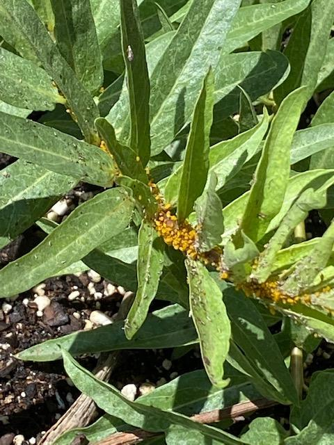 June 7, 2021 – Aphids on the milkweeds – Oh no you don’t! I made a soap/water concoction to spray on the aphids and although it took care of them, it also just about did my milkweeds in. They all shriveled up and dried out but amazingly they all came back. Cathy Johnson had suggested putting flour on them the next time.
