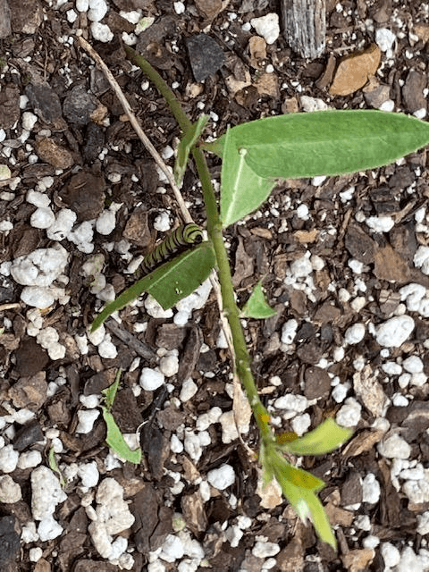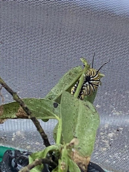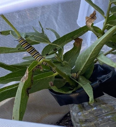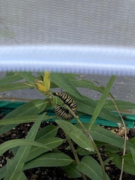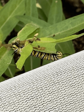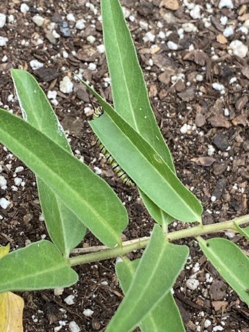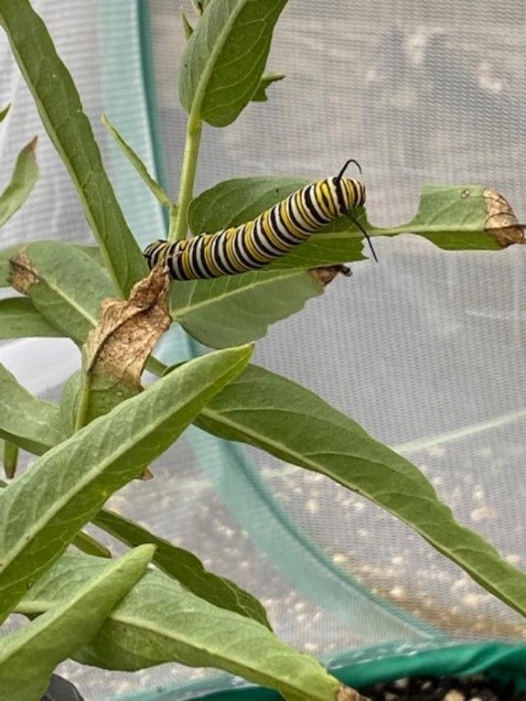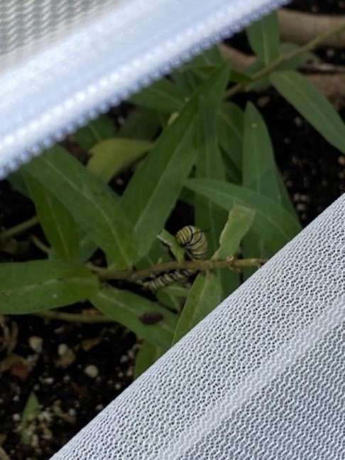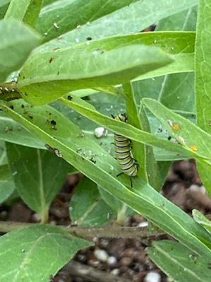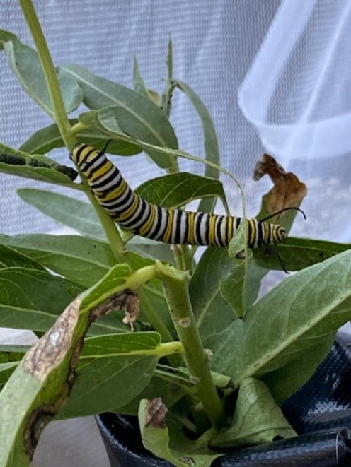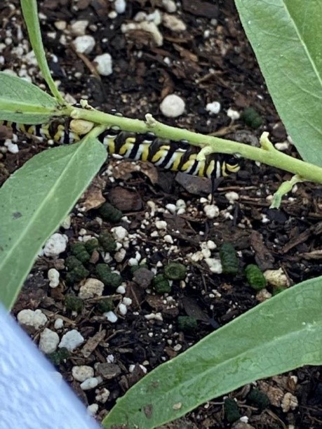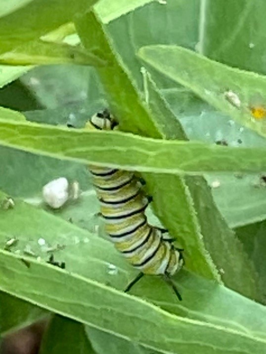 July 19, 2021 – I was beside myself to see the first monarch caterpillar on one of the milkweeds. The excitement and adrenaline overwhelmed me.