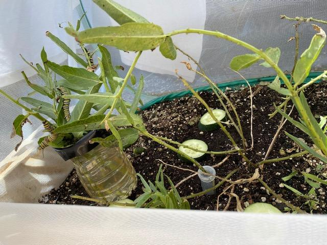 July 20, 2021 – The last couple of days I have been obsessed with checking on the caterpillar several times a day and found two more on the other milkweeds and placed another enclosure over those. Unfortunately, that side didn’t have as many milkweed leaves so again I sought advisement from Cathy and she said I could try sliced organic cucumbers.