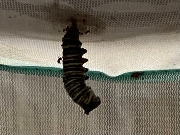 July 26, 2021- The last one that stayed inside the enclosure has begun to form the “J” which is the beginning of the transformation to a chrysalis.