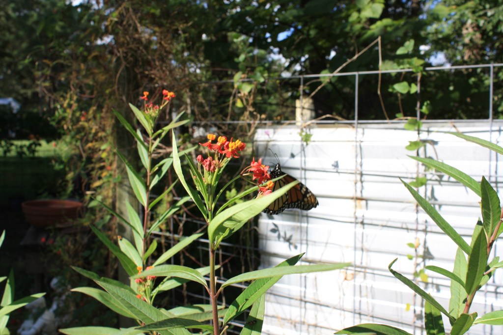 Today (October 24, 2021), I walked through my garden to catch one of the last monarchs heading south, lovely and gentle as she had a little sip from a milkweed in my garden.