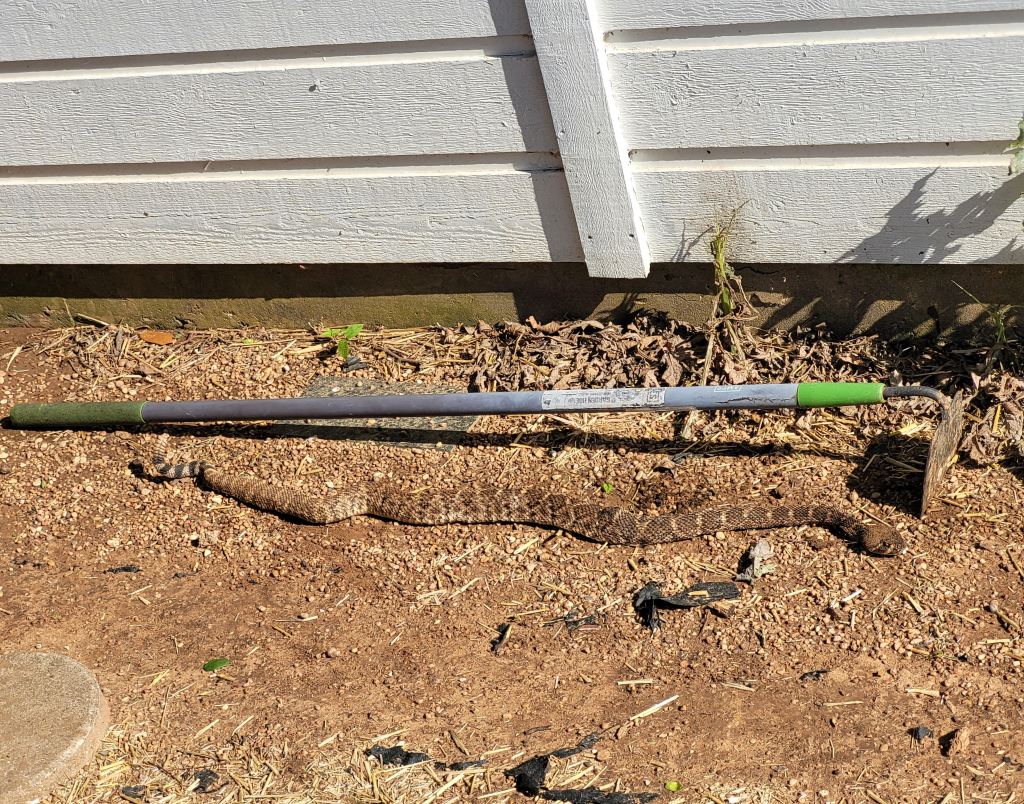One of our dogs, Dottie cornered this rattlesnake and kept barking until we came to check. She kept it from entering the backyard and shed.