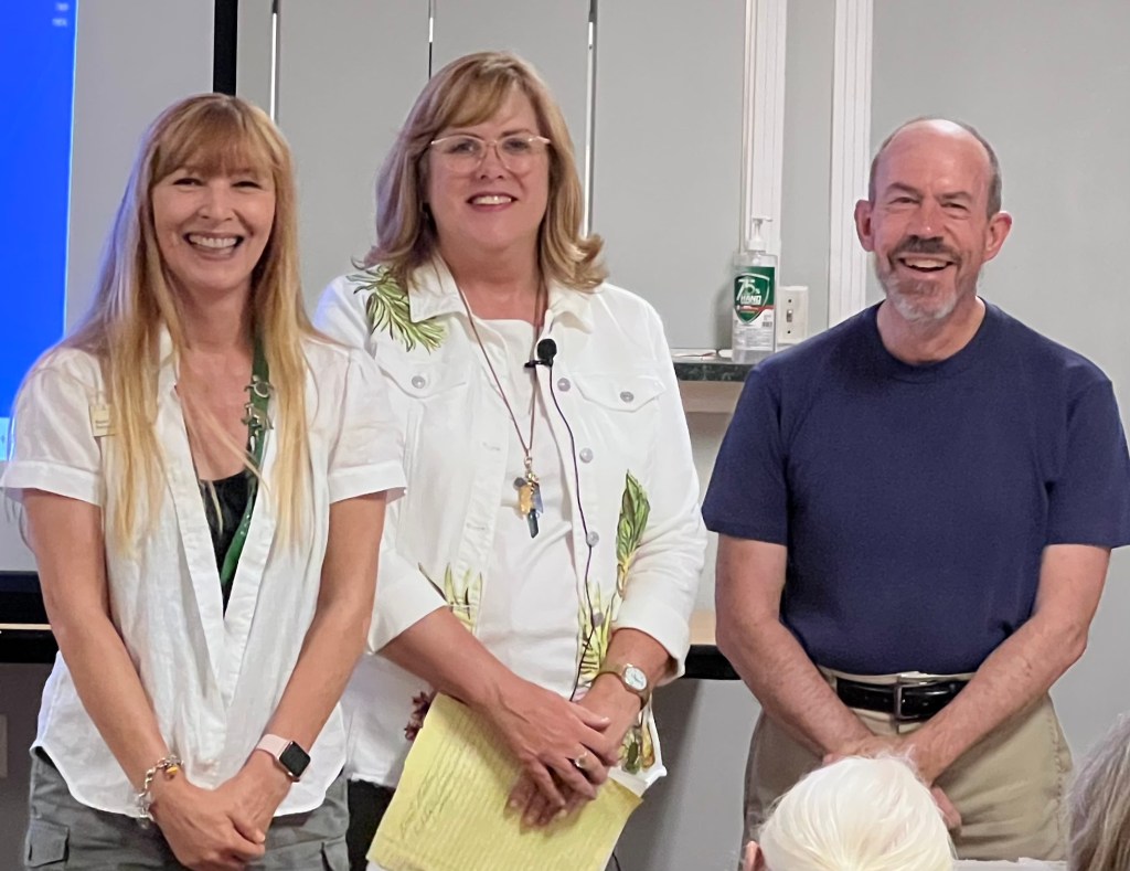 After the speaker, we held our usual meeting. I was struck by how much work goes into each meeting (I’m glad I was there to help our substitute sound man and A/V guy in his first solo outing!). The decorations our hospitality team sets out are always so pretty (this week was a beach theme). And it always impresses me how much hard work our members do to get their annual recertification pins! Plus, our hard-working record-keeper, Lisa Milewski manages to keep track of our hours, order pins, and make sure we have a clue as to what we are doing with our volunteer time. She’s always so cheerful, as is our President, Carolyn Henderson, which you can see in the photo. She can herd cats with the best of them!