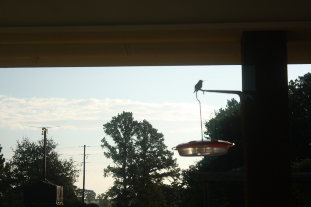 But when it comes to the feeder, one little guy will not let anyone else have a sip. He sits on top of the L bracket that holds the feeder on our front porch. He sits there all day until dusk. I’m sure he spends more calories protecting the feeder than he would if he would just share. Somebody’s mother needs to have a talk with him.