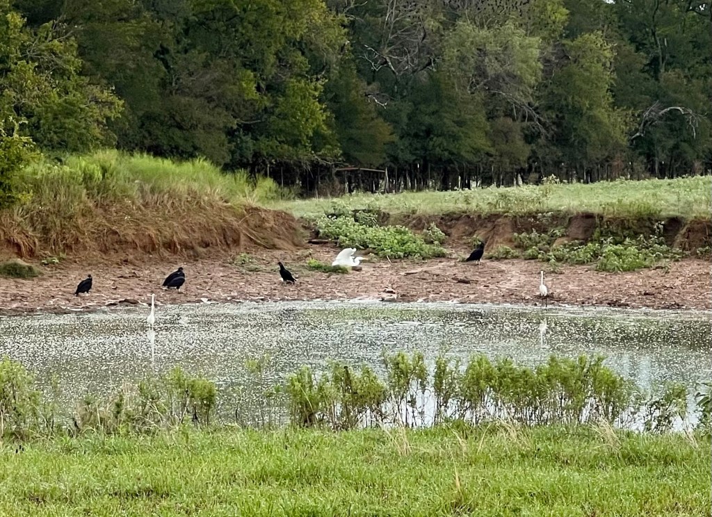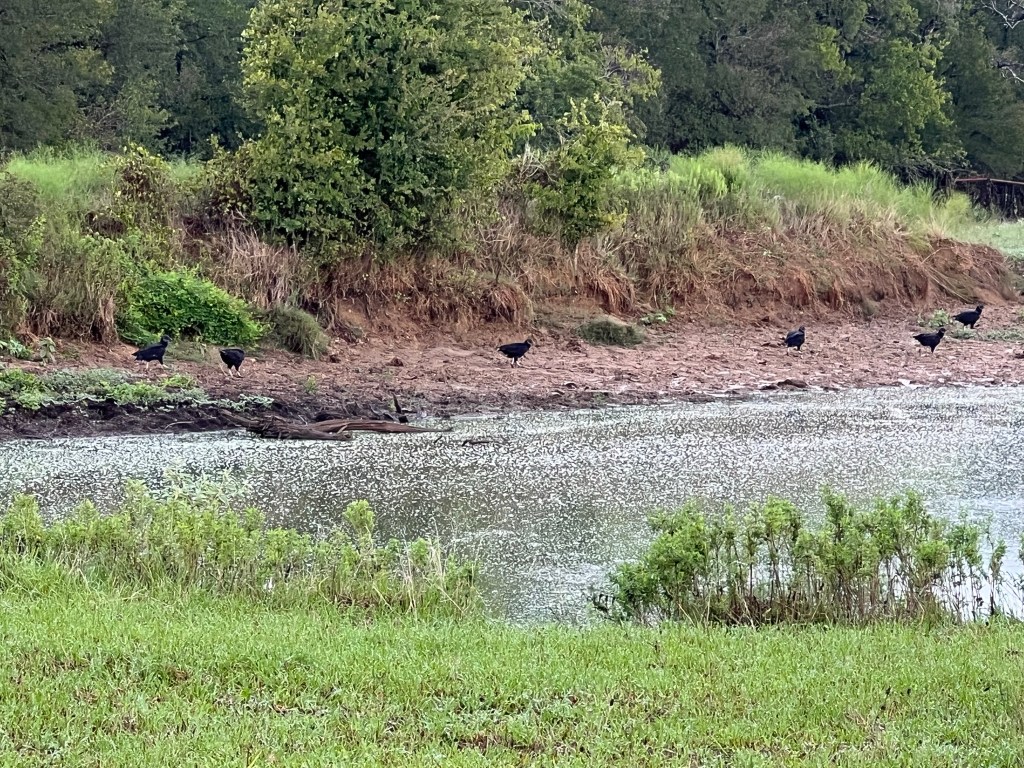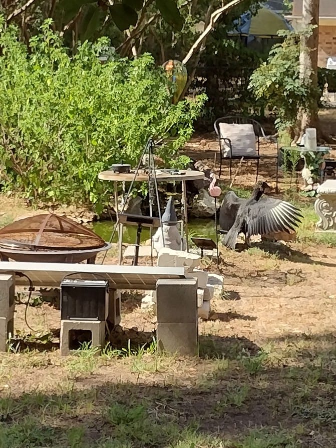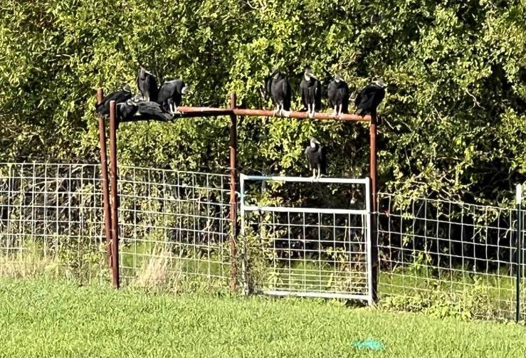 Debbi shared that their barn is a vulture nesting headquarters for a pair, and that they enjoyed watching one with just stumps for feet (Old Peg) as it grew. Debbi shares her garbage with them and gets lots of observations in return. I also enjoy watching them. They are graceful in the air but are pretty fun on the ground. I love to watch them as they hop, hop, hop around my tank behind the house.
