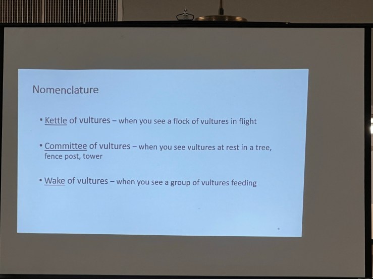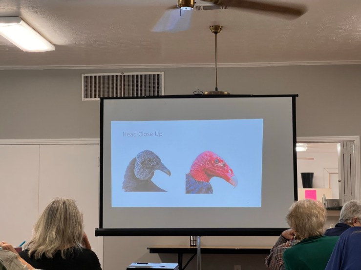 Debbie also shared the ranges of both birds and told us about their breeding behavior, which is to lay two eggs in abandoned buildings or dead trees and raise them there. George Bowman, a visitor to our meeting, shared how he had a baby vulture raised on his front porch this year (which many of us had enjoyed on Facebook). He ended up with a poopy porch, but a successful fledging of the baby.