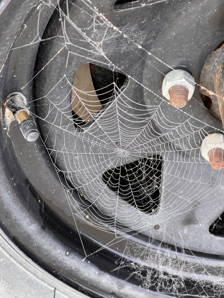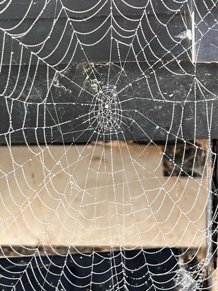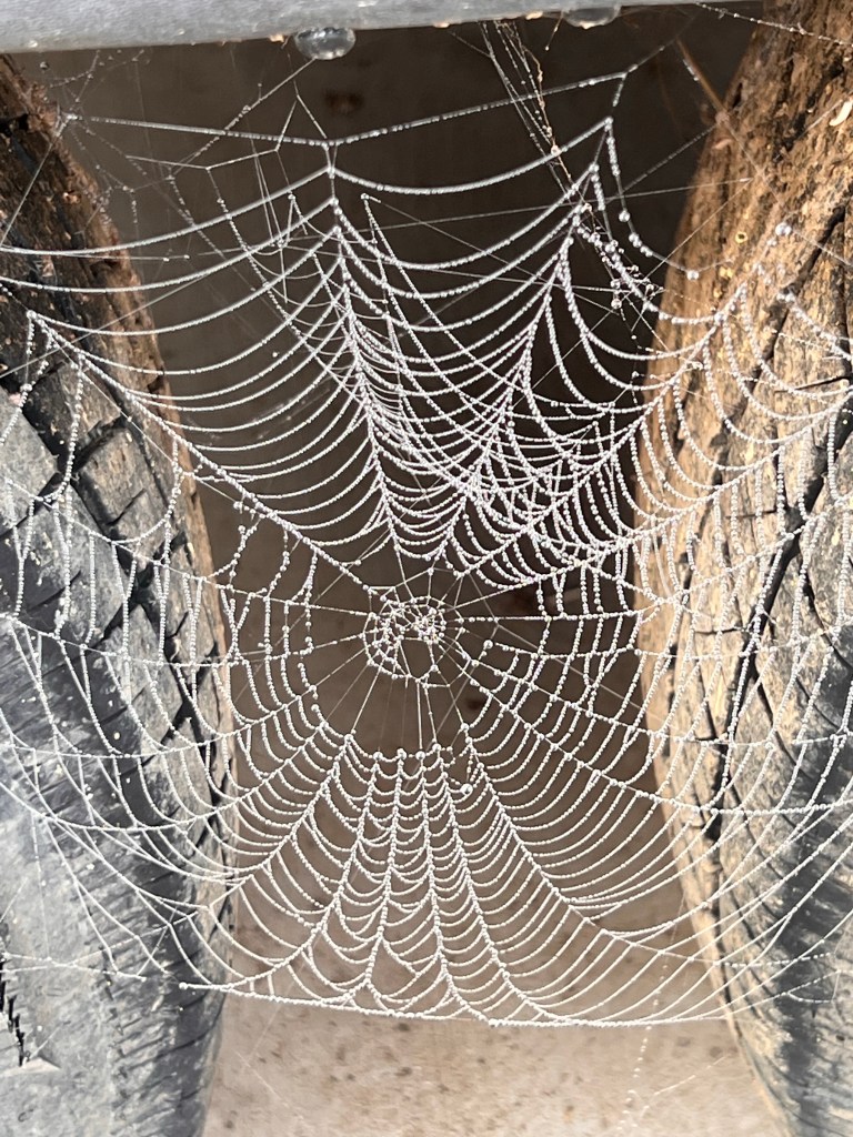 Yesterday morning, it was very foggy at my house. As usual, I stopped to enjoy the droplets of water in the grass and hanging on the chicken wire at the henhouse. On my way back from feeding the chickens, I happened to glance at the steps to the RV that’s parked next to our garage. I was entranced by the jewel-like effect the dew had on the spider webs that are usually just busy trapping flies and other insects.