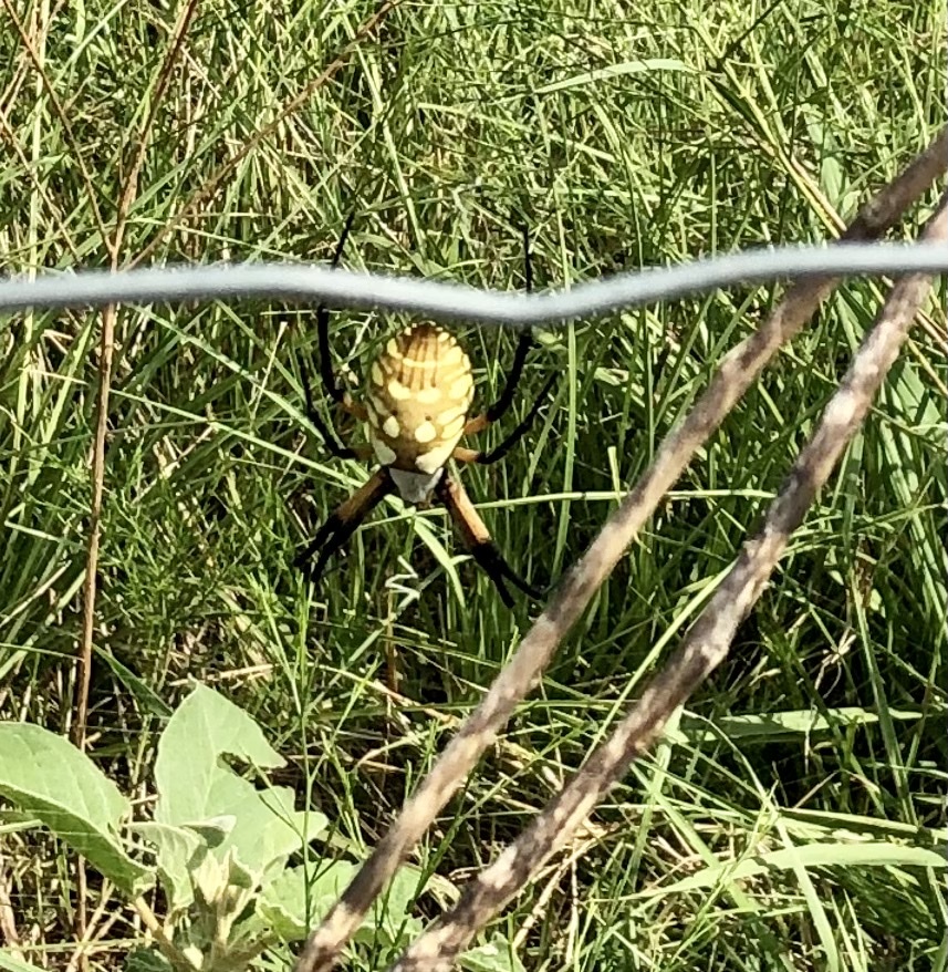 I do think maybe one or two of the webs were made by different spiders, especially the one by the front gate, which was made by an old spidey buddy of mine, who, judging by her coloration, is probably the Spotted Orbweaver (Neoscona crucifera). These webs aren’t quite as neat and tidy as the ones by the RV.
