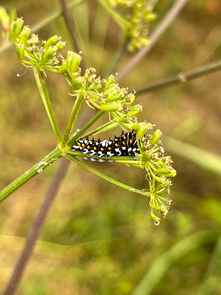 Today I was looking for butterflies on this plant, Polytaenia texana. I didn’t see any at first. But that’s when I realized there were at least a dozen caterpillars in this one plant.