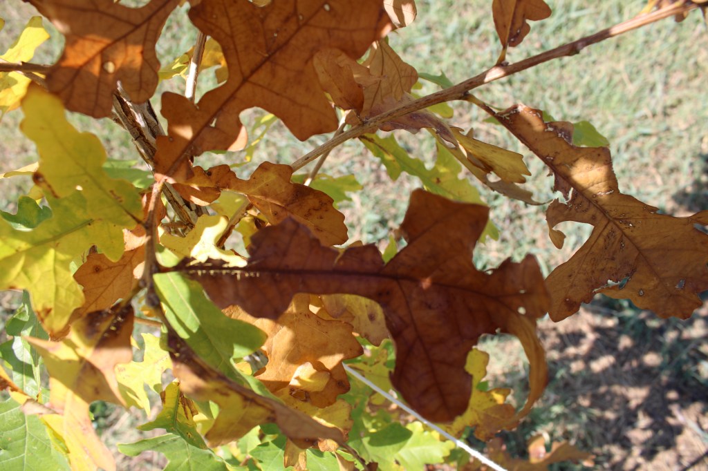 The Orchard Park tree has looked very good until just this week. It is losing some leaves. On close inspection, it looks like some of them are being eaten by something. There are still mostly green leaves on it. The Wilson Ledbetter tree is the one that was laid over from that storm. It still leans a lot, but it is putting up new leaves from the ground. I’m not sure what to do about the still leaning part. The tilt is about a 45 degree angle.