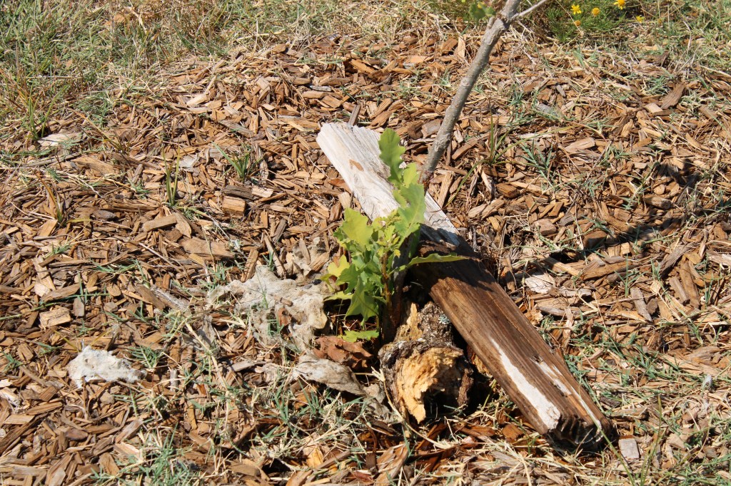 They all took a serious wind storm hit about a week (or so) after they were planted. It caused two of them to lean notably, but a little action was taken to try and set them upright. The Wilson Ledbetter Park tree was nearly on the ground. They did seem to recover from that event. Then came the heat. About three weeks ago, I drove by the city park to take a look at it and found it leafless. The leaves had died on the tree and fallen around it. This was a surprise because it seemed to be doing very well. It didn’t even lean over in the storm. I got out of my car to take a closer look. It appeared like it was going to bud out again. A week later it had new leaves. I don’t know what made the leaves die, but the theory is transplant shock.
