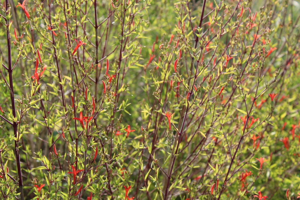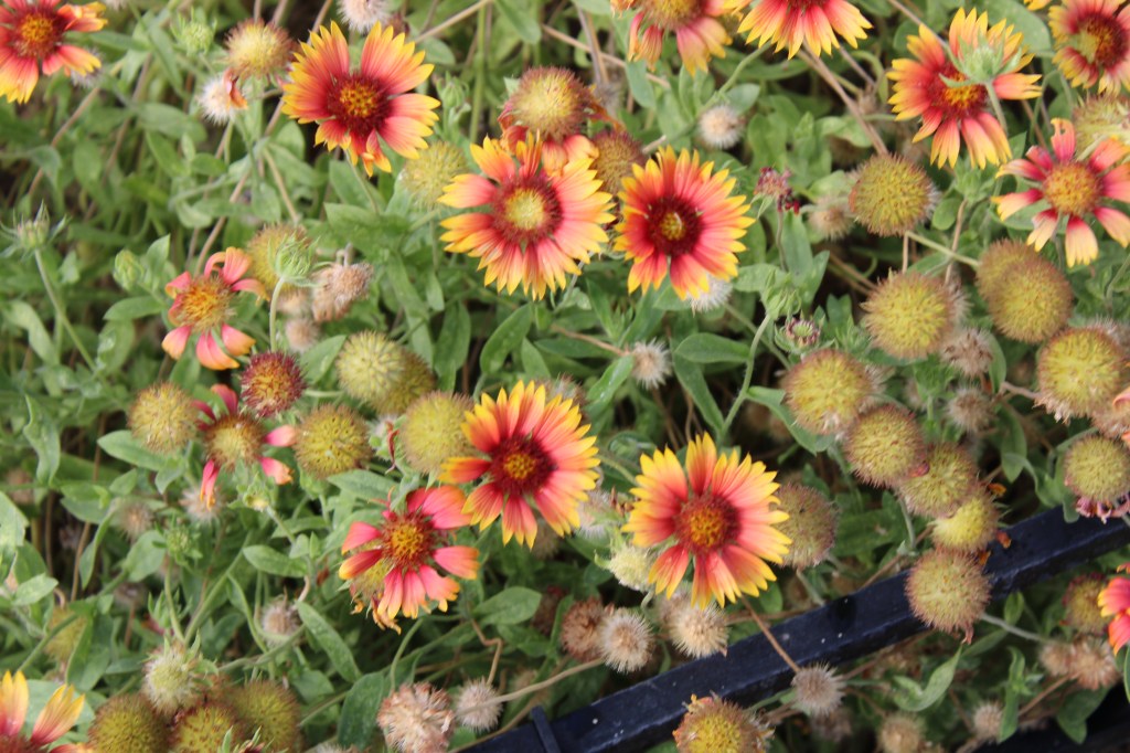 The color palette has also changed. The purples had mostly gone to seed, and oranges, yellows and reds have taken over. Three to four types of bees and Gulf Fritillaries were enjoying the blooms.