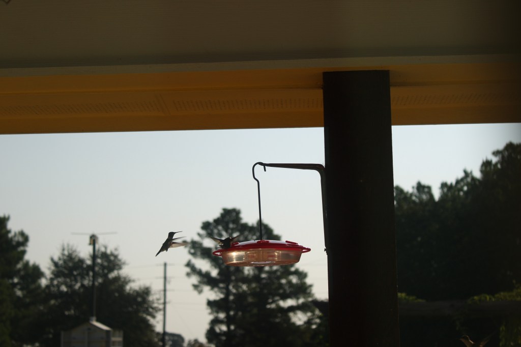 This morning I had a nice surprise! I looked outside on our front porch and saw about 8 Ruby-throats trying to run each other off the feeder. Hummingbirds do not share very easily. They must have to talk to each other first and come to an agreement before they all land and take a meal together. Always competitive.