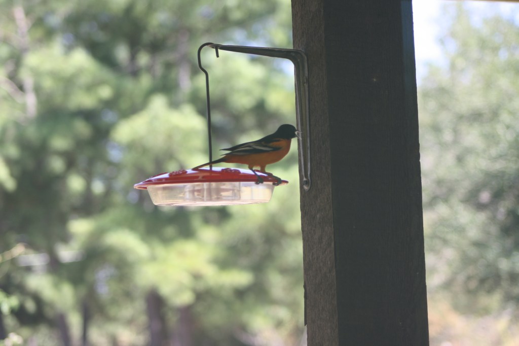 This morning I looked out our front window to check on one of my hummingbird feeders. I went oh, what is that big orange thing! It was a male Baltimore Oriole!!
