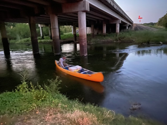 Adam and I put boats into the water of Yegua Creek below the Hwy 36 bridge in Somerville. It was before dawn, and I was hoping to paddle the first portion of a 13-mile run in moonlight. As luck would have it, we were running a bit too late, and the moon was slightly obscured by thin clouds anyway. Angie was our driver and her photographs taken as we shoved off show an orange dawn sky looking downstream. Turns out it was a darn good thing we could see well because the first three miles of this trip seemed like a combination of paddling through a Venezuelan jungle and the log-ride at Six Flags. We needed full visual acuity. Short-statured elm trees reached far out from each shore, and you had to weave around them. Open shorelines were densely populated with sedges, rattle bean, millet, and smartweed. Somerville Dam was just a mile upstream and was releasing 366 cubic feet per second to supply users down near the Texas coast. In this 40-60-foot-wide channel the water was pushing hard toward the Brazos and shoving our boats with it.