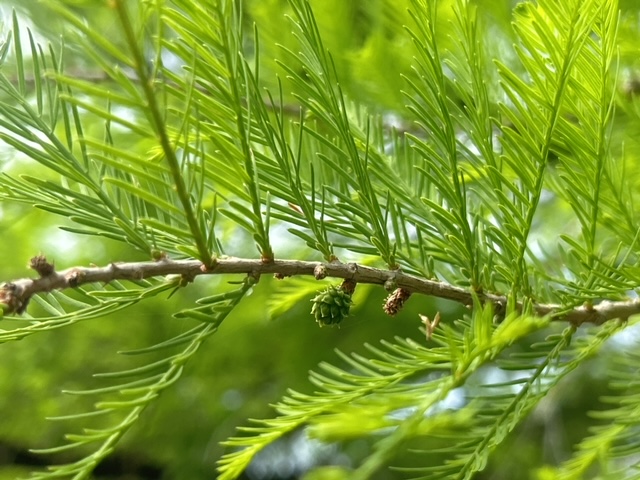 I have both Montezuma and bald cypress around my pond and have watched them develop differently for years. I observed my bald cypress in Burleson County to be flowering in late January. These trees have male catkins that are about 2 inches long which emerge from the end of last years twigs. Just below those pollen-emitting catkins are small female flower parts that resemble tiny pine cones. The amazing thing to me is that these delicate flowers bloom when it is almost a dead certainty that several hard freezes will arrive before spring. Across North America and as far north as Delaware bald cypress are shown to flower in January. Here in Texas the flowers are exposed for as much as 7 weeks before any new leaves begin to erupt in March.