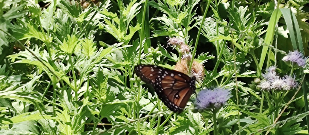 On Saturday morning I took a side trip to the El Camino Real Texas Master Naturalist City Wildscape to find a pleasant surprise in the overgrown mess. Queen butterflies had found the place. I counted about 20 that morning – all on the Gregg’s Mist. That is by far and away the Queens’ favorite nectar producer.