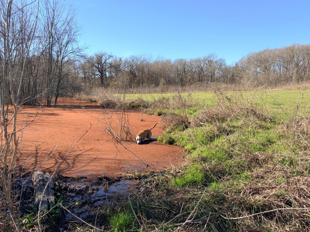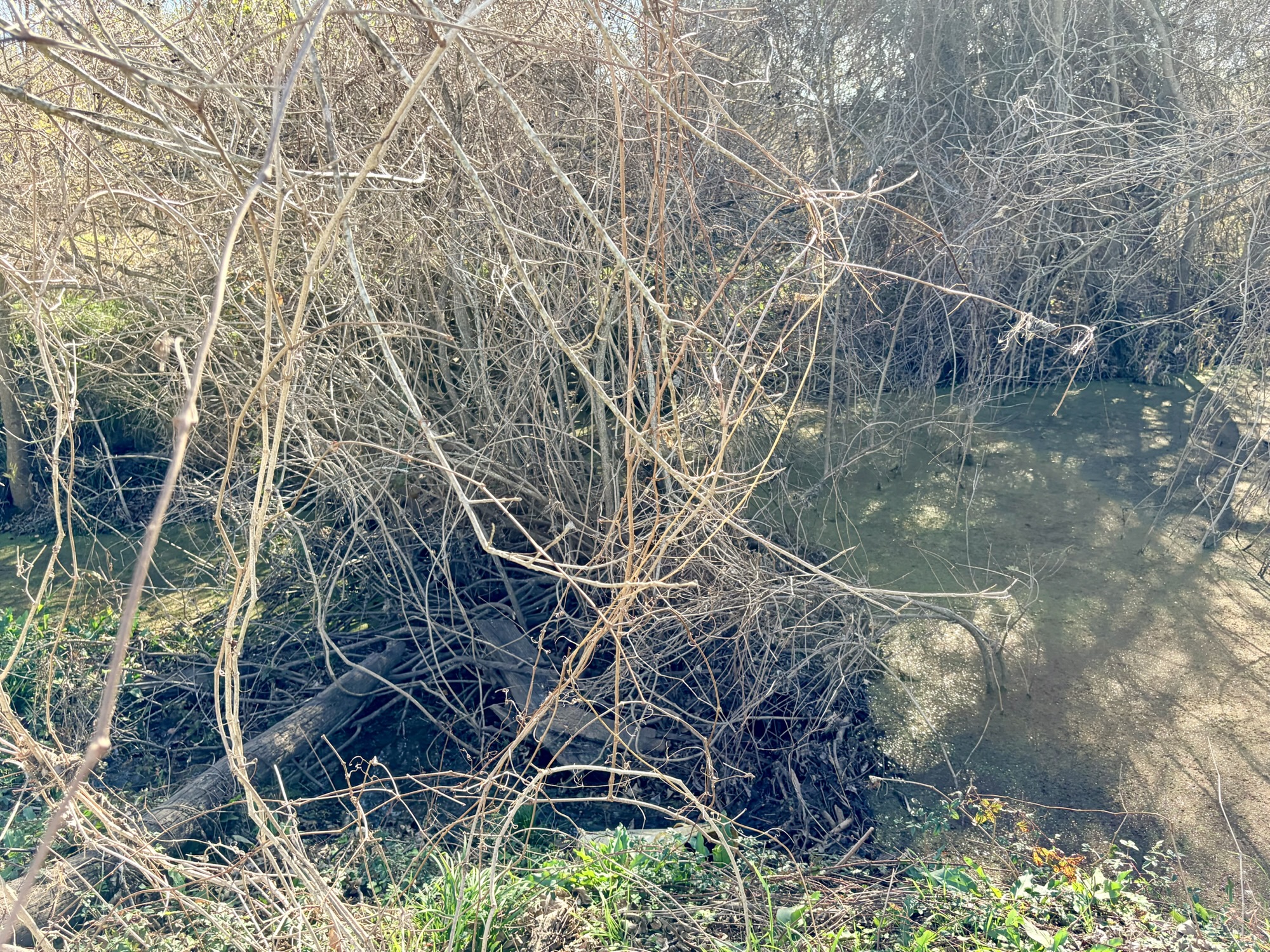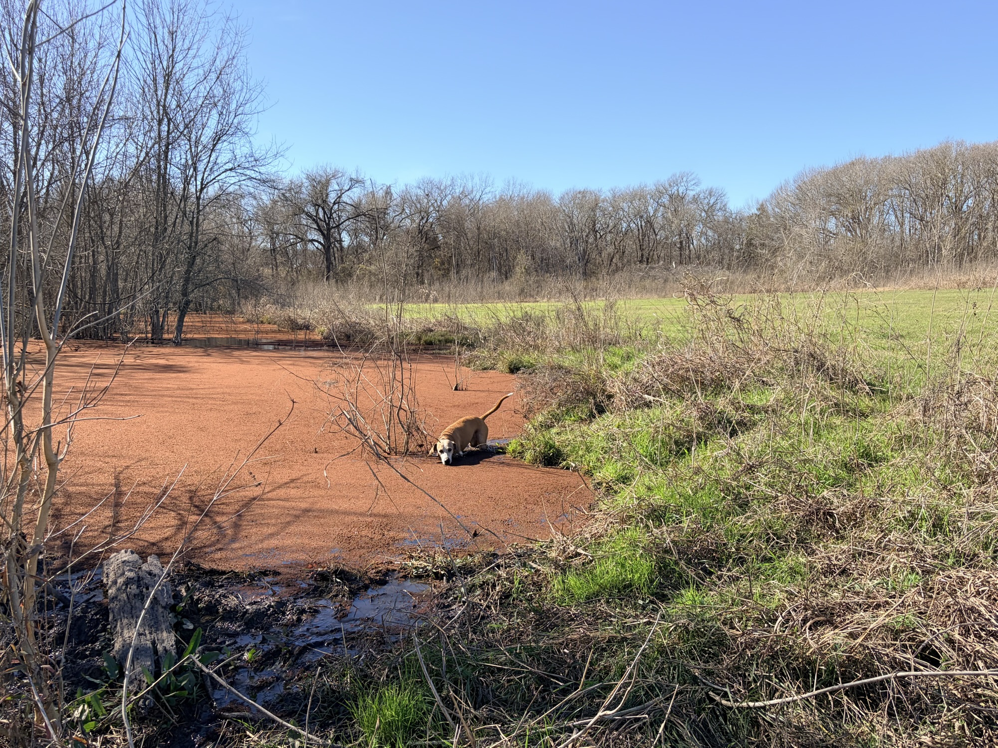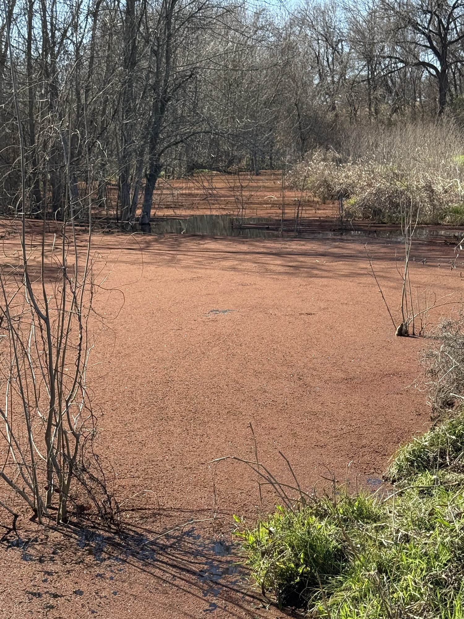 My friend called the folks who’d been on the property monitoring their deer lease or something, and they redirected us upstream. There we found what appeared to be weird flat areas with brown vegetation.