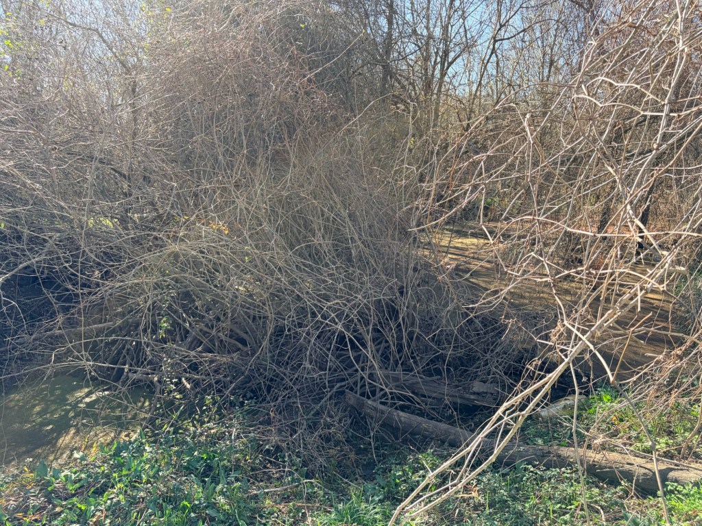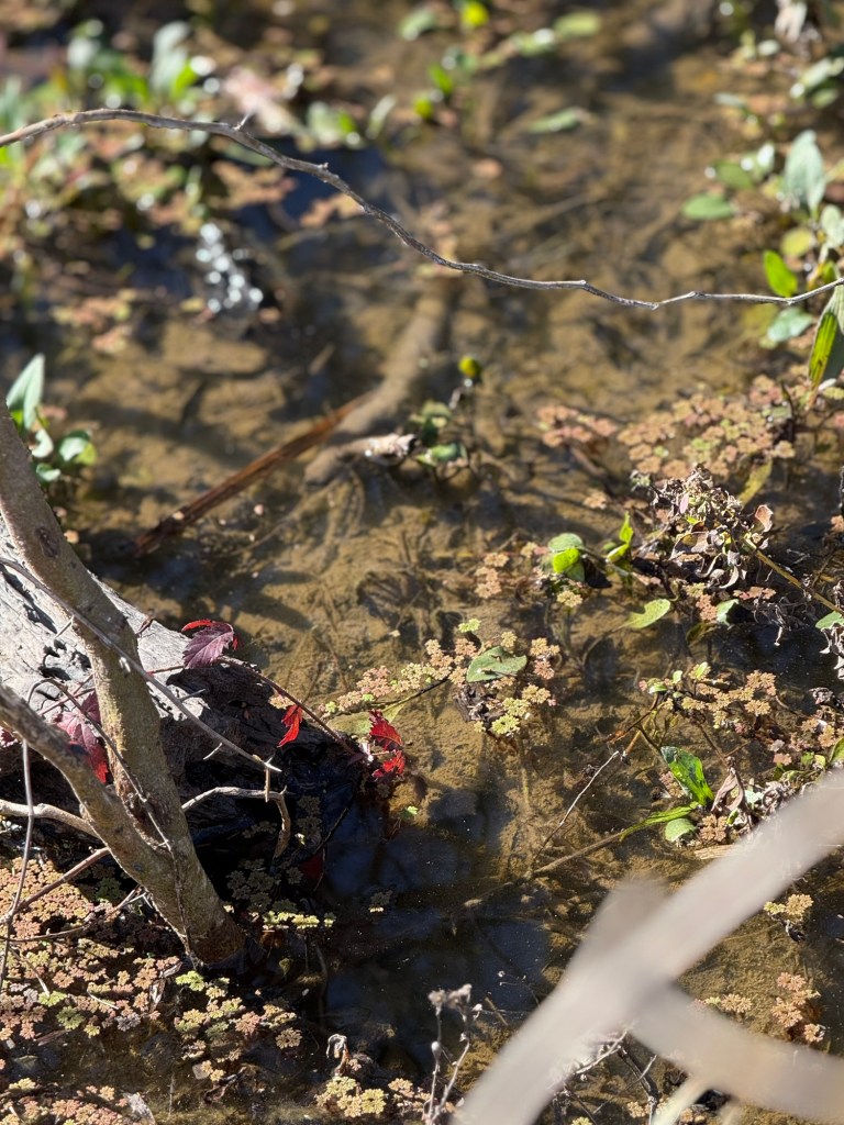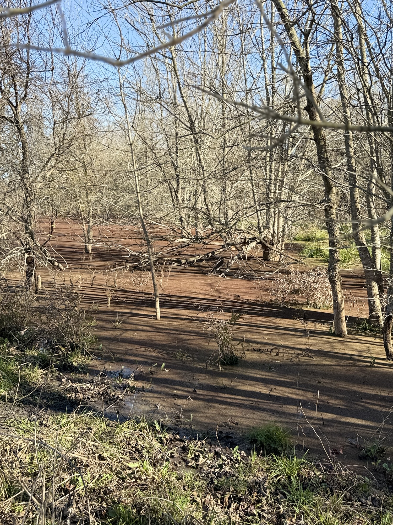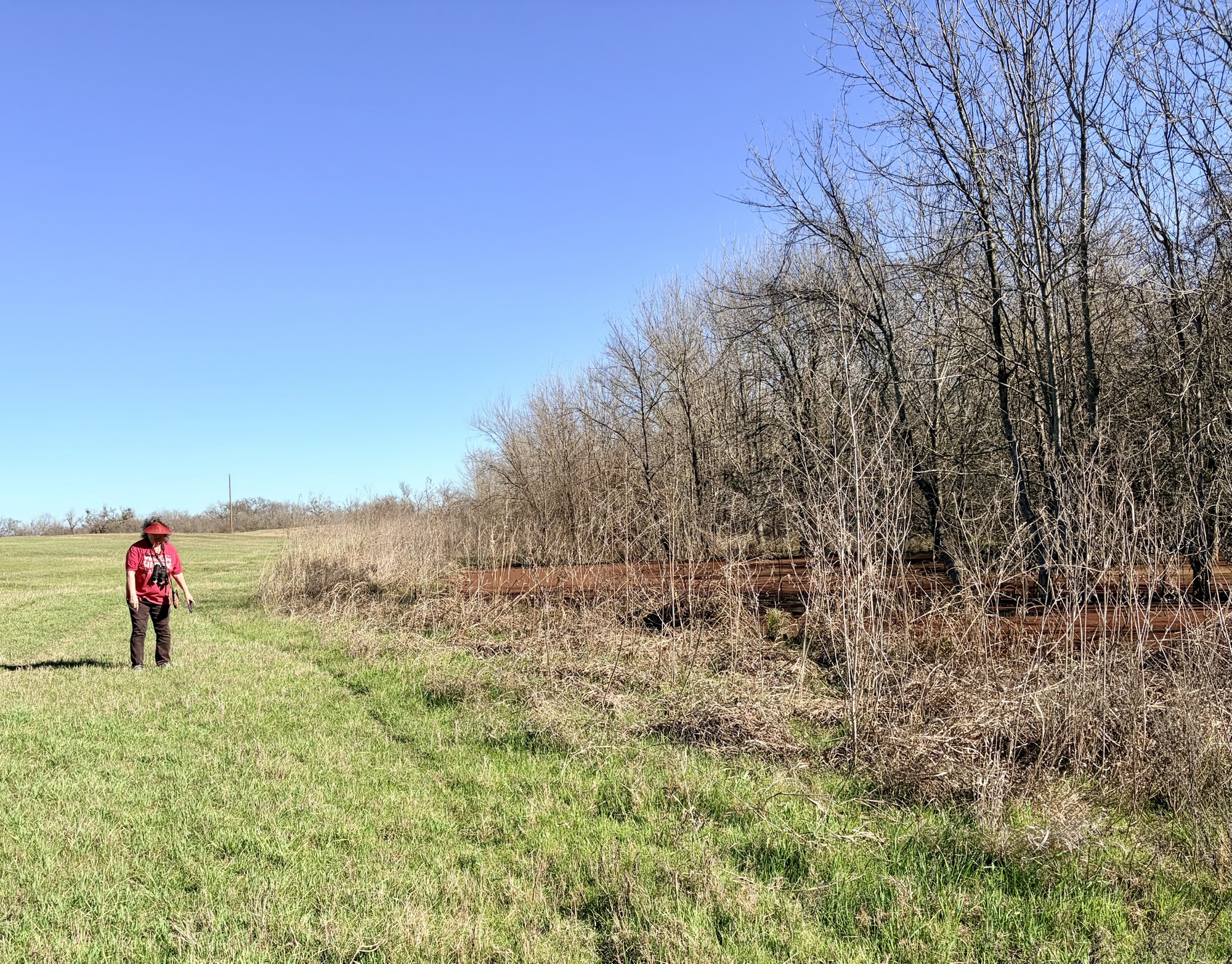 My friend called the folks who’d been on the property monitoring their deer lease or something, and they redirected us upstream. There we found what appeared to be weird flat areas with brown vegetation.