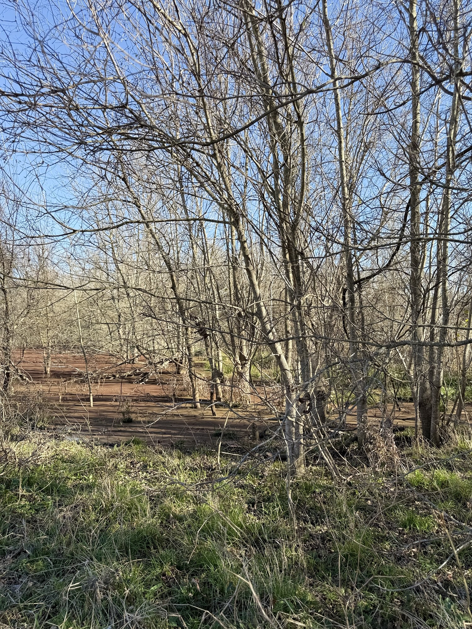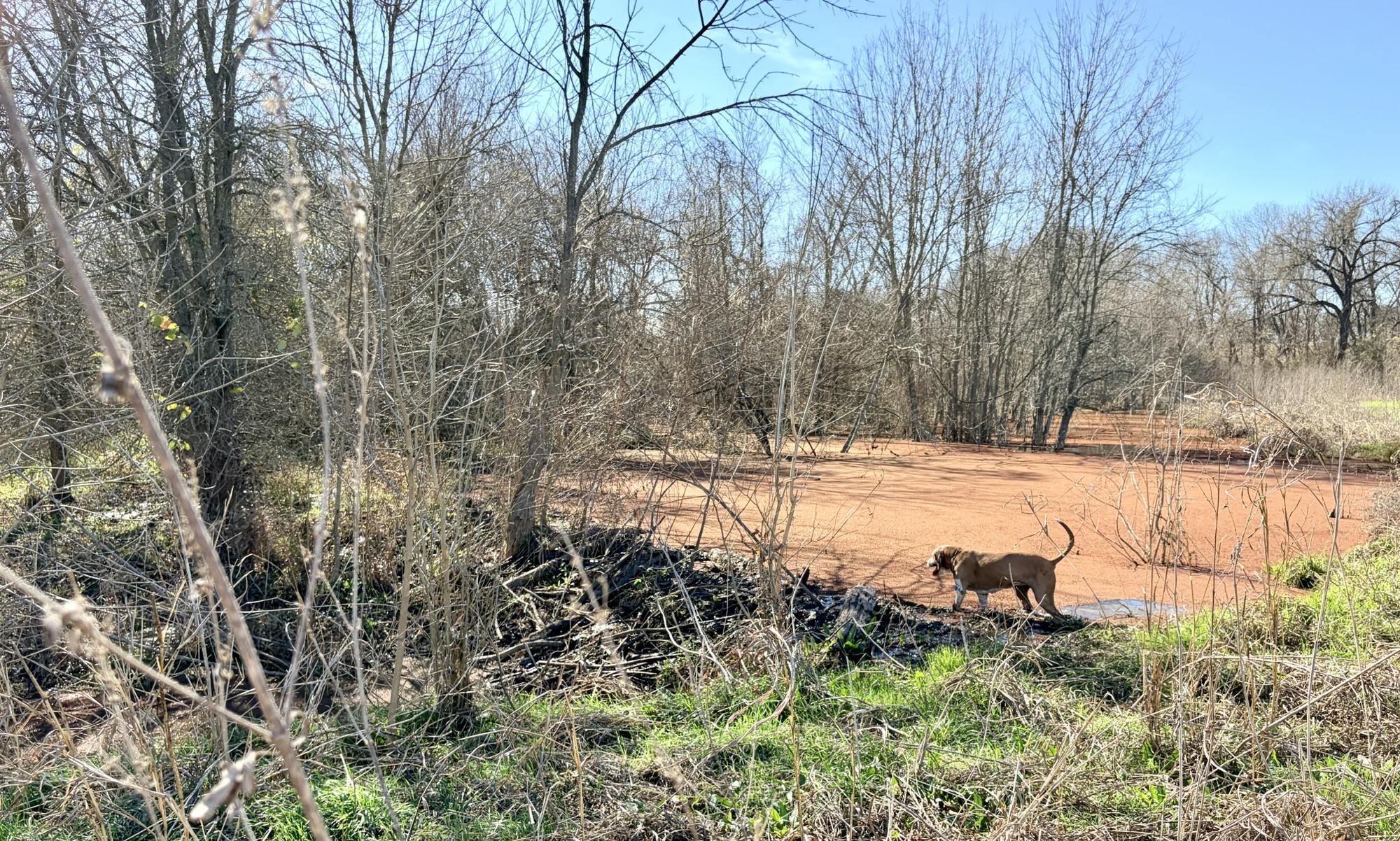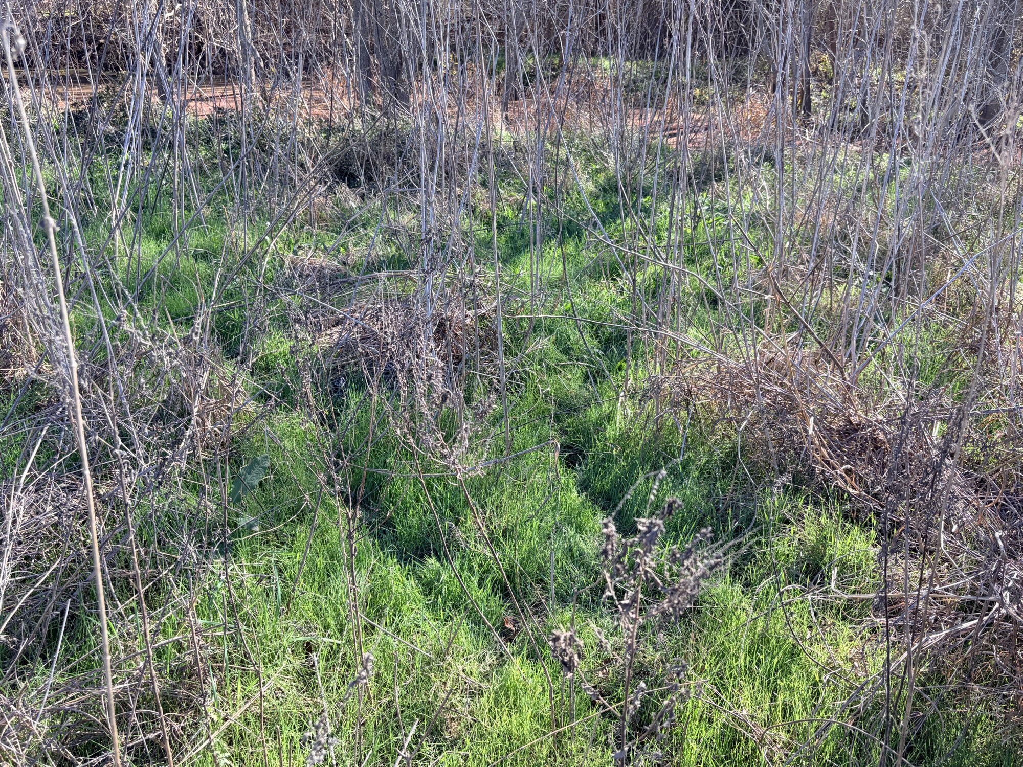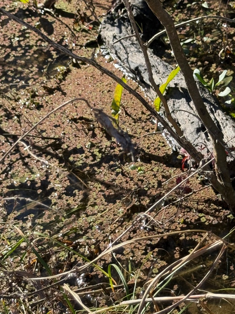 My friend called the folks who’d been on the property monitoring their deer lease or something, and they redirected us upstream. There we found what appeared to be weird flat areas with brown vegetation.