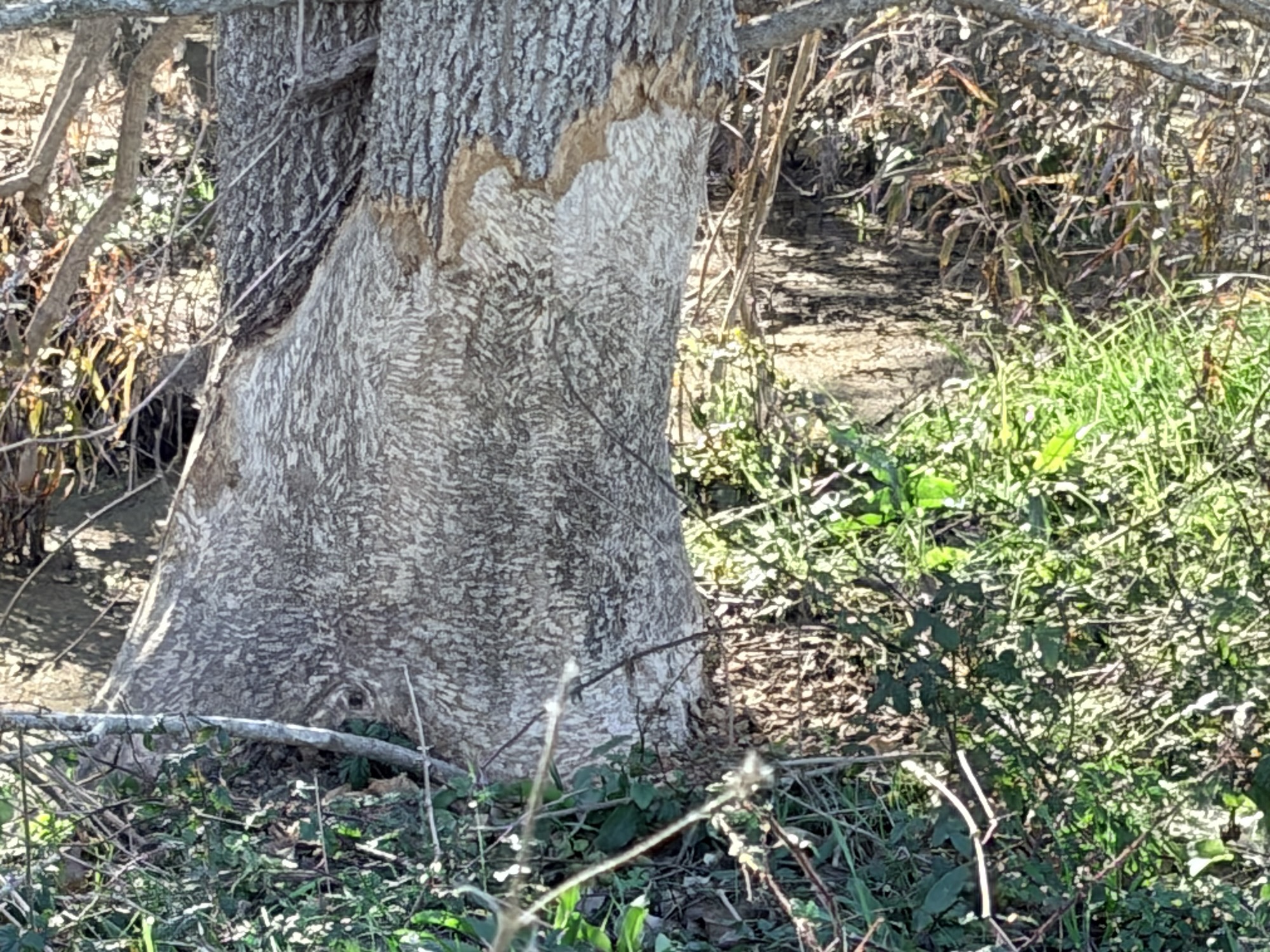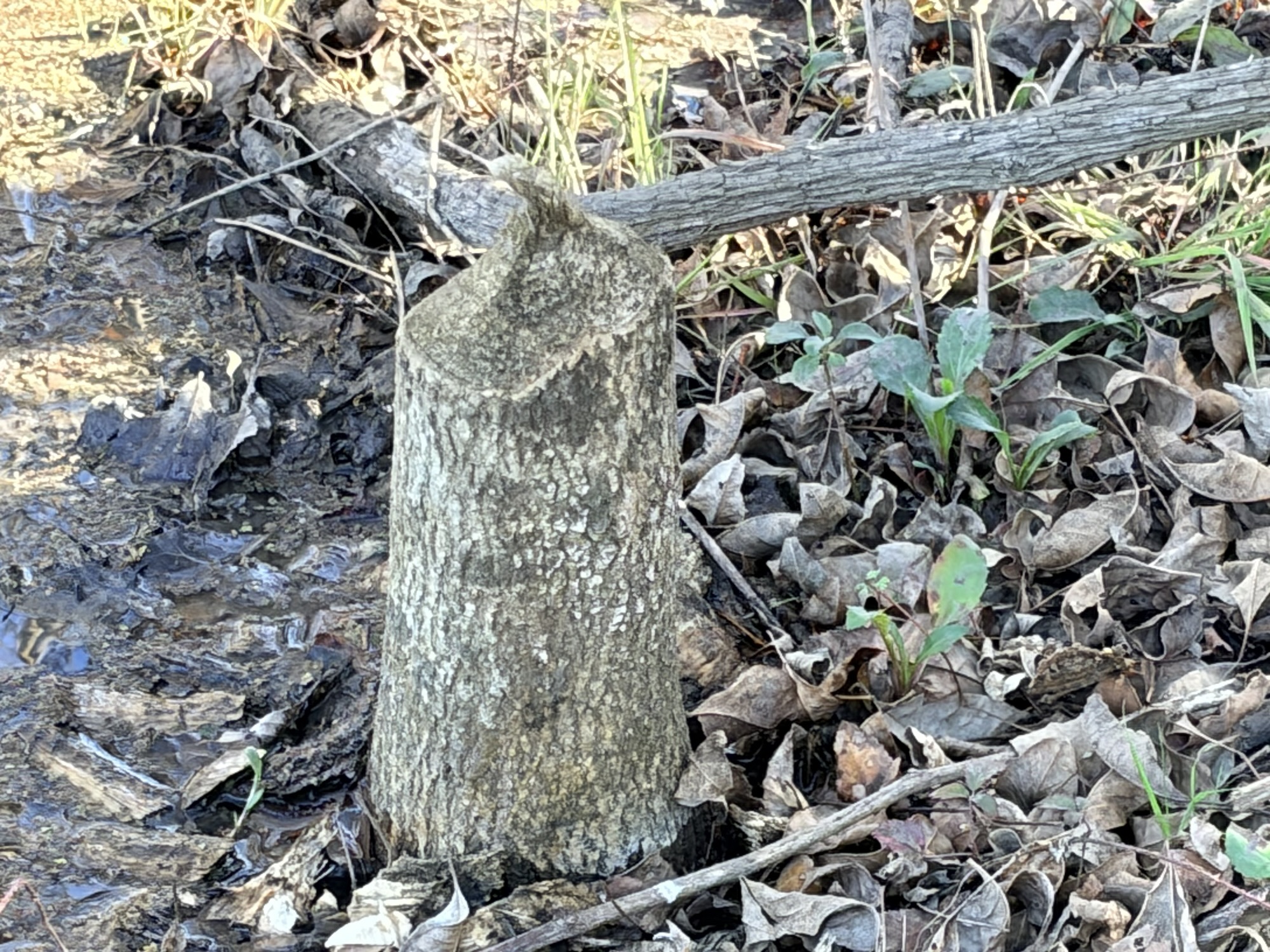 We found trees that had been gnawed by beavers (some from the previous dam a few years back). There were also trees whose bark had been gnawed. This definitely points to beavers!
