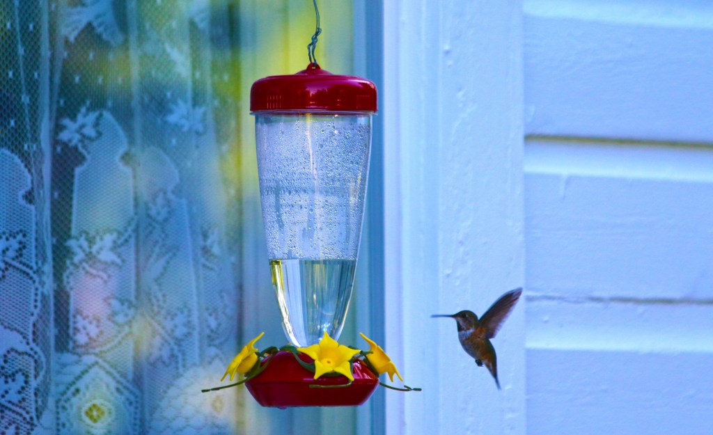 I took these photos of the hummingbirds through the window on my front porch. If they see motion they take off, so I have to be slow. I have two more feeders in my garden. I like the flat feeder you see in the first photo the best. It is easy to clean.