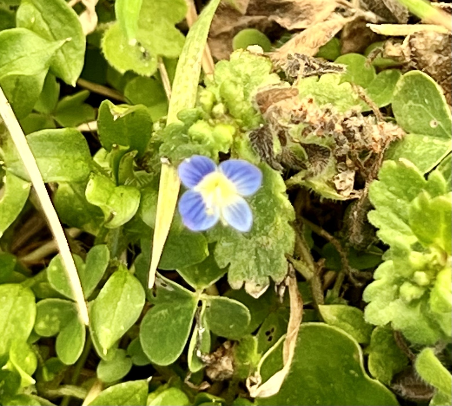 Thursday evening before the new student’s class at the Episcopal Church, I did a little “belly botany” and found a large patch of Bird’s-eye Speedwell (Veronica persica) nearby.