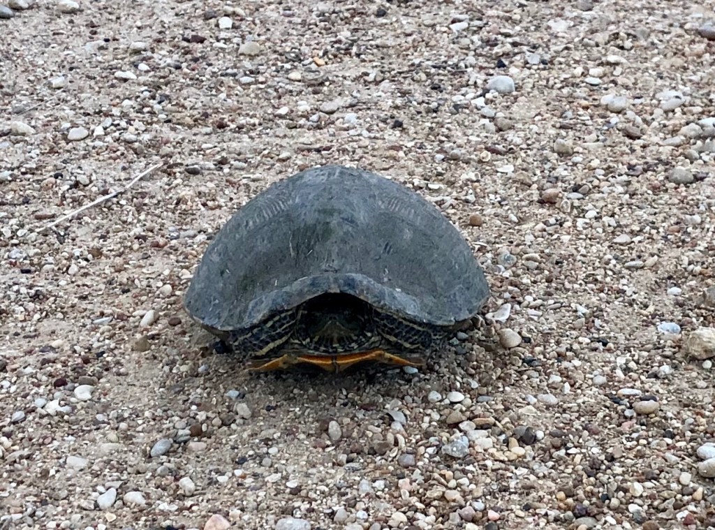 Red-eared sliders like muddy bottoms and slow moving water. These are the turtles that pet stores used to sell a lot of, which is not a happy thing for the turtle. They are wild and need to be out somewhere in a pond, in my opinion.