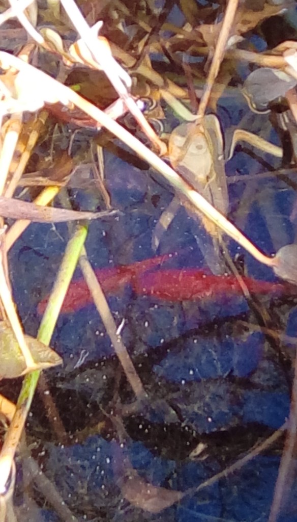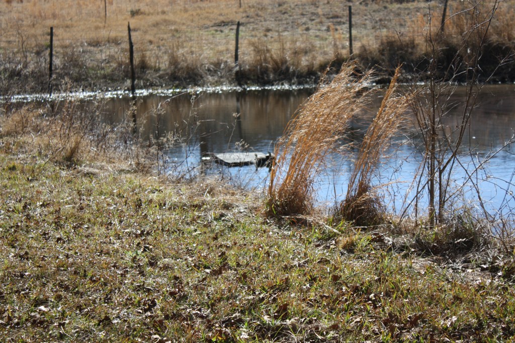 It’s often hard to get to from our place, because there’s a fence marking a property line that ends in a place that stays damp for a long time after it floods. But, the recent tree-killing knocked it down in a spot, so I could explore the pond while it’s full.