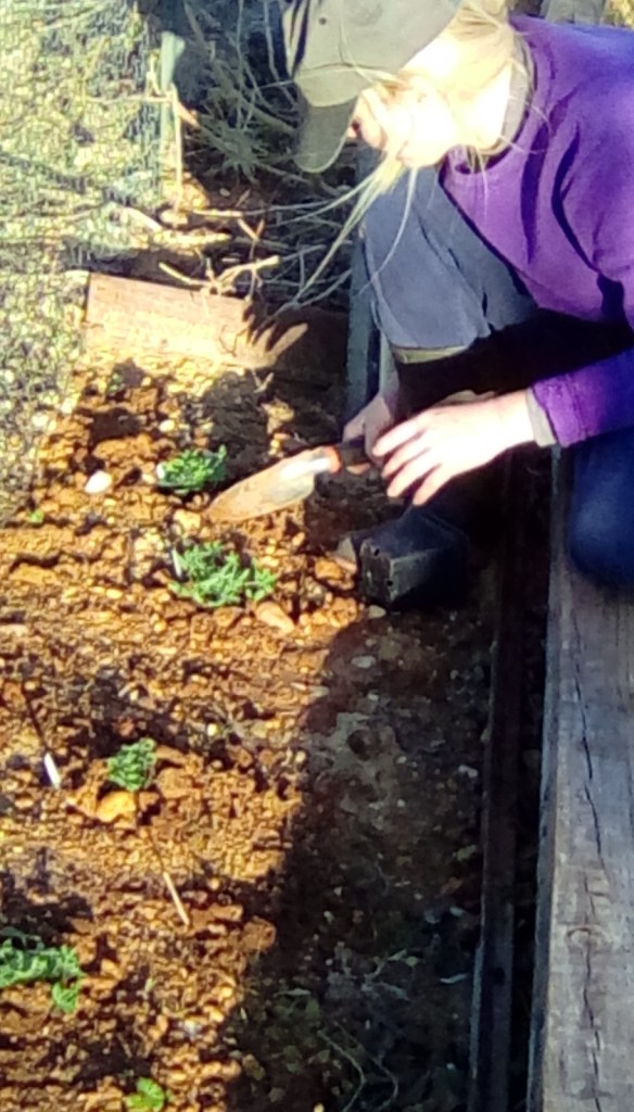 Kim planted blue Salvia and Rock Rose, and Rosie started a Bluebonnet patch. Mexican Plum and Arroya Sweetwood are the next additions.
